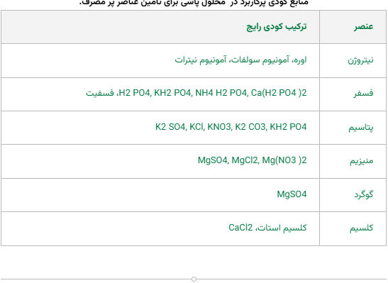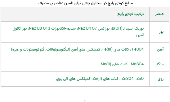 منبع کودی مورد استفاده برای محلول پاشی نقش مهمی در افزایش کارایی تغذیه برگی گیاهان دارد. در جدول های زیر به منابع کودی مهم برای عناصر پرمصرف و کم مصرف و همچنین محرک های رشد برای تغذیه برگی اشاره شده است.