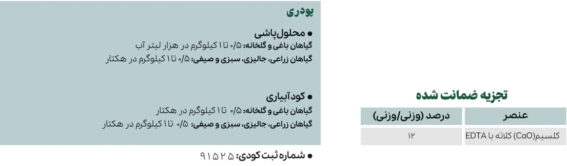 کود سی ای زایز، کلات کلسیم با عامل EDTA است که با دارا بودن ۱۲ درصد کلسیم به صورت کلات، نیاز محصولات مختلف به این عنصر را رفع مینماید. با توجه به تحرک کم کلسیم در گیاه، ترکیب کلاته آن سرعت حرکت و دسترسی آن برای گیاه را به طور موثری افزایش داده، بنابراین نیاز گیاه به خوبی تامین میشود.