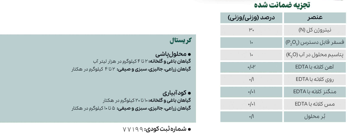 کود کامل گروزایز 30-10-10، کود نیتروژن بالای محلول در آب است که شامل نیتروژن (30 درصد)، فسفر (10 درصد) و پتاسیم (10 درصد) و ریزمغذیها است و عناصر مورد نیاز گیاهان را تأمین مینماید. این ترکیب با تحریک رشد رویشی گیاه در مراحل اولیه رشد و همچنین تشکیل و توسعه ریشه و میوه گیاهان مختلف توصیه میشود.