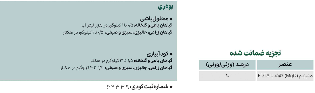 کود ام جی زایز، کود کلات منیزیم با عامل **EDTA** است که به طور خاص، برای تأمین منیزیم مورد نیاز گیاه طراحی شده و با جذب و تحرک بالایی که در داخل گیاه دارد، کمبود منیزیم گیاه را به سرعت رفع مینماید. این ترکیب به صورت پودری بوده و فاقد هر گونه ناخالصی است.