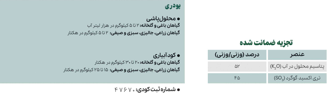 زایز اس او پی که حاوی ۵۲ درصد پتاسیم و ۱۸ درصد گوگرد (به فرم عنصری) (۴۵ درصد به فرم سولفات) است از پرمصرفترین کودهای کشاورزی به حساب میآید. پتاسیم باعث تنظیم فعالیتهای سلولی و فعالیت آنزیمها شده و در ساخت پروتئینها، افزایش میزان قند میوهها، افزایش میزان عملکرد نهایی و افزایش تحمل به تنشهای زنده و غیرزنده تأثیر دارد.علاوه بر این، گوگرد موجود در این ترکیب، در تولید پروتئینها، فعالسازی آنزیمها و بهبود رشد گیاه نقش دارد. همچنین به تنظیم pH محیط اطراف ریشه کمک میکند. به دلیل حلپذیری بالا، پتاسیم سولفات پتاسیم کریستال زایز با خلوص بالا، یکی از بهترین منابع تأمین پتاسیم مورد نیاز گیاهان است و برای همه محصولات کشاورزی به صورت محلولپاشی و کودآبیاری قابل استفاده است.